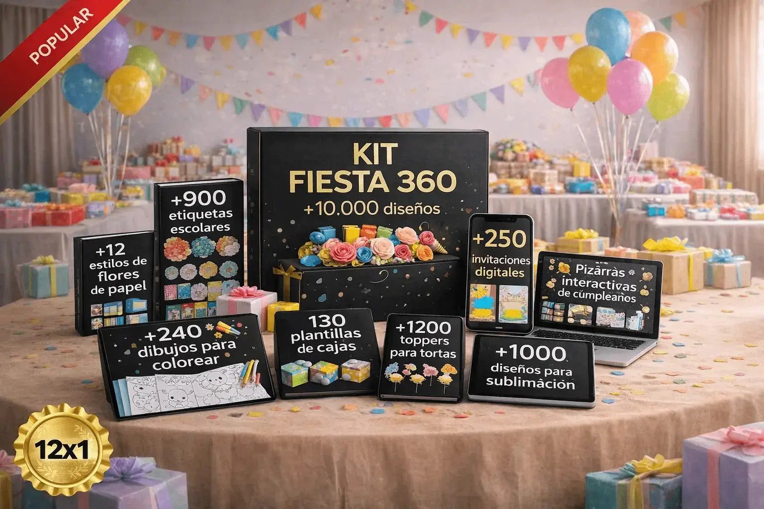 Incluye más de 10.000 diseños personalizables para imprimir y usar: invitaciones, toppers, cajas, banderines, etiquetas, stickers, fondos y mucho más.